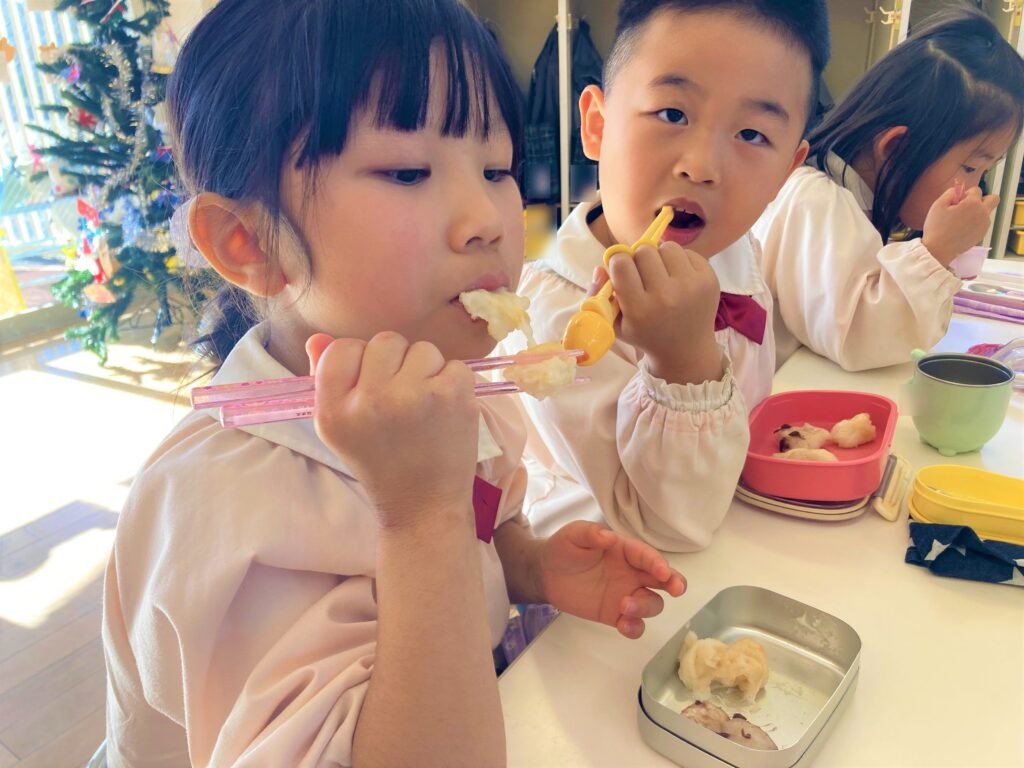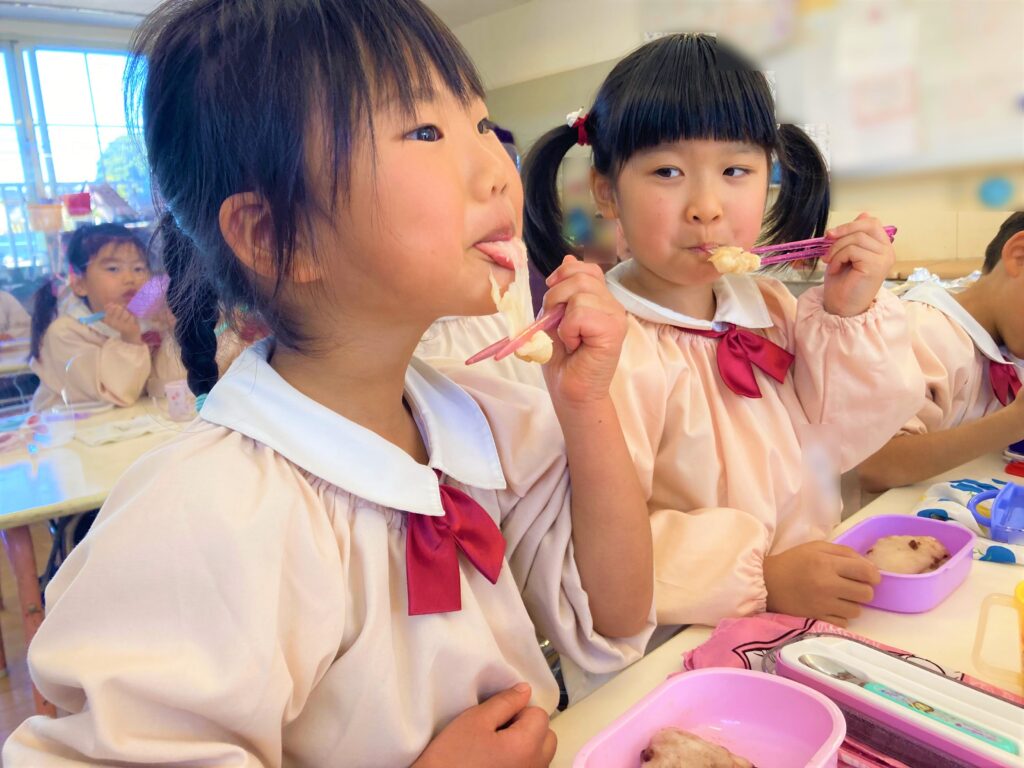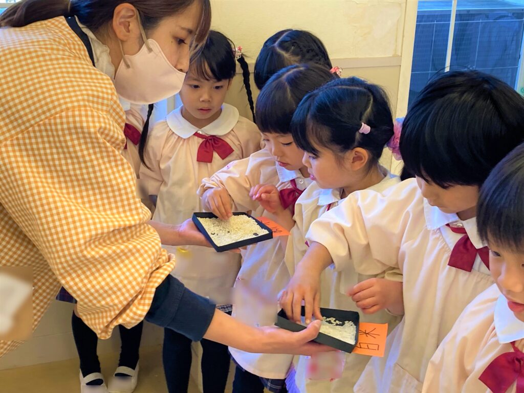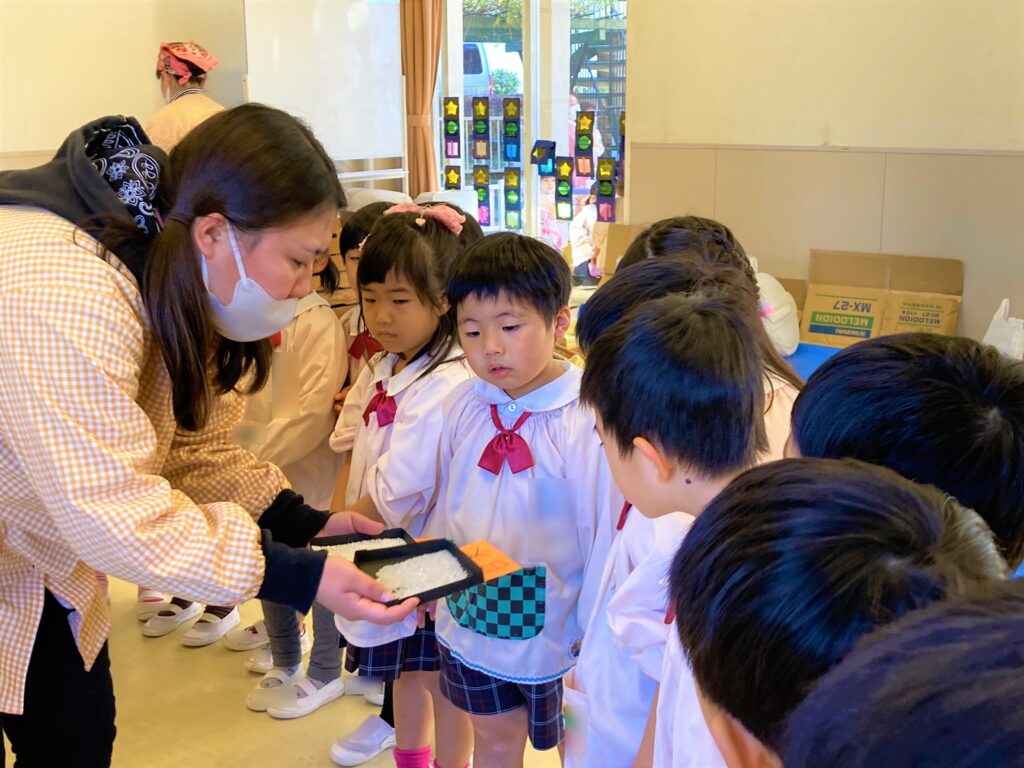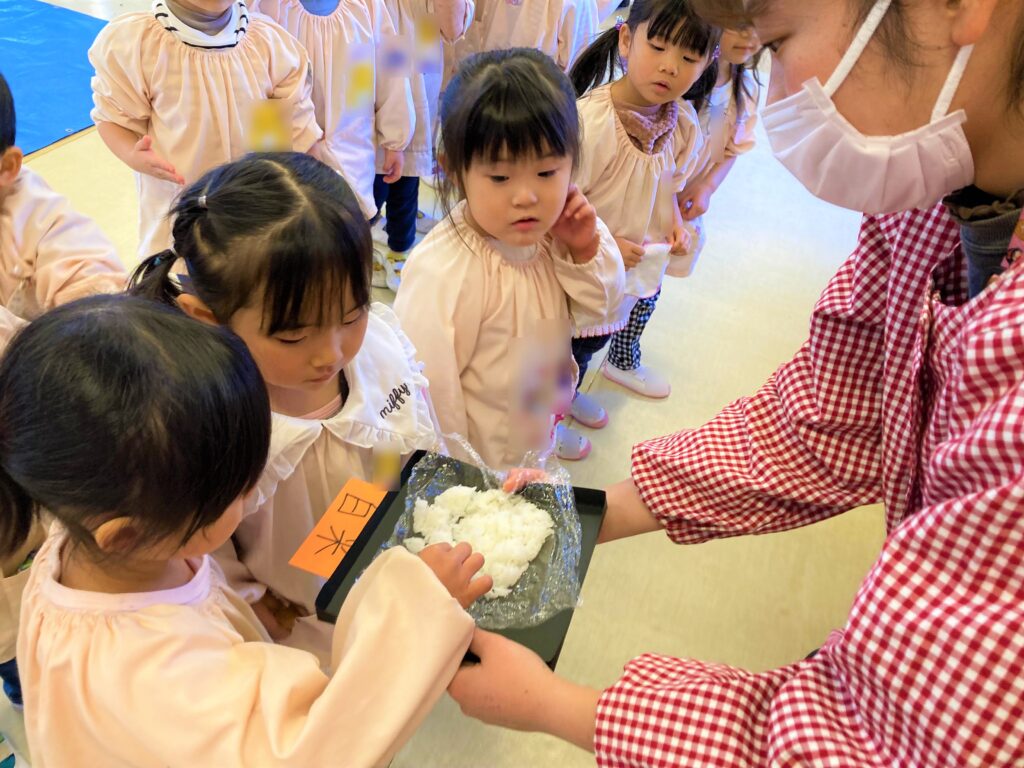 ↓もち米の試食を食べました!よ~く噛むとお口の中でお餅になると知り、味わって食べる子どもたちでした😆🎵