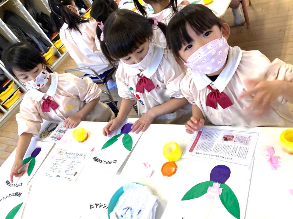 1/4の折り紙をさらに1/4に子どもたちが切りました。指先も器用になり、上手にチューリップを折りました♪