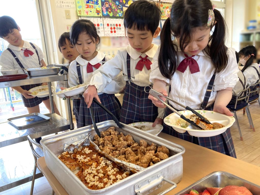 からあげやハンバーグ、ポテト、子どもたちが選んだ献立にフルーツ3種が食べ放題❣