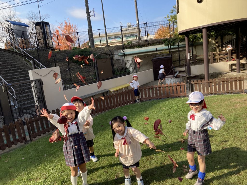 ↓落ち葉をみんなでかき集め「先生見ててね!せーの!!」の声と同時に鮮やかに紅葉した葉っぱがひらひらと綺麗に空から降ってきました🍂
