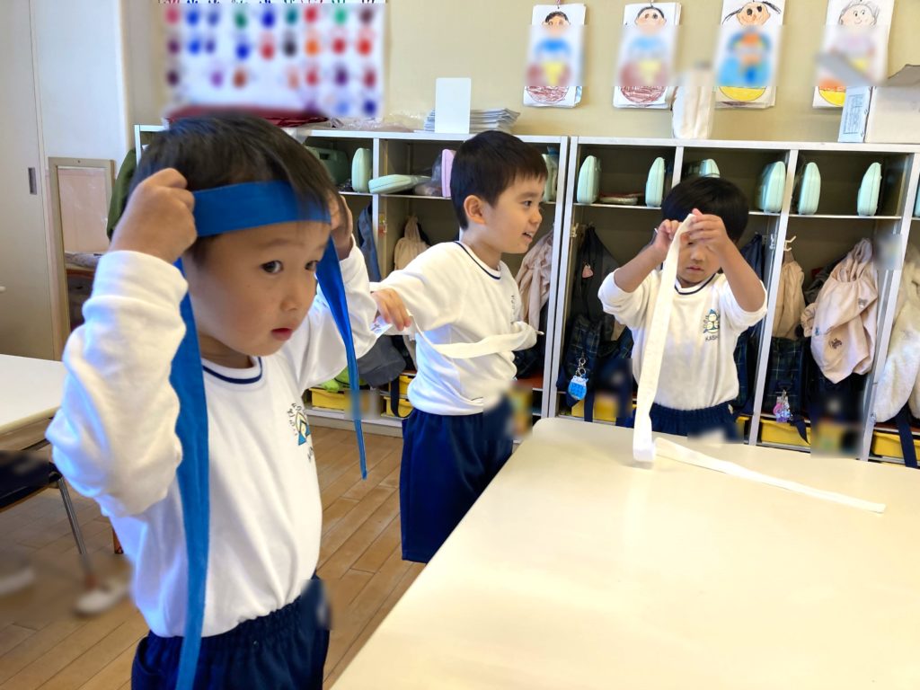 ↓進級に向けリトミック指導で使うハチマキを自分で巻くことに挑戦❗