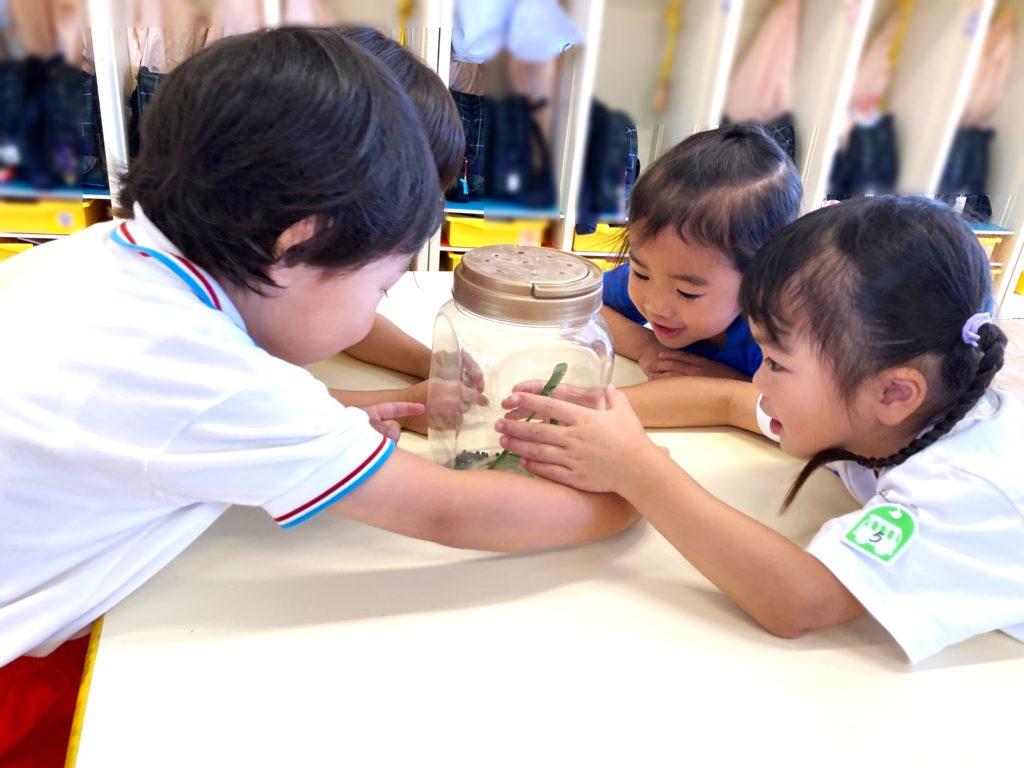 園庭で虫を捕まえたり、元気よく走り回って遊ぶ年少組さん✨