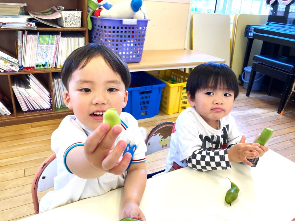 そら豆の皮むき体験やお楽しみ保育、様々な活動に取り組む子ども達でした👦👧💕